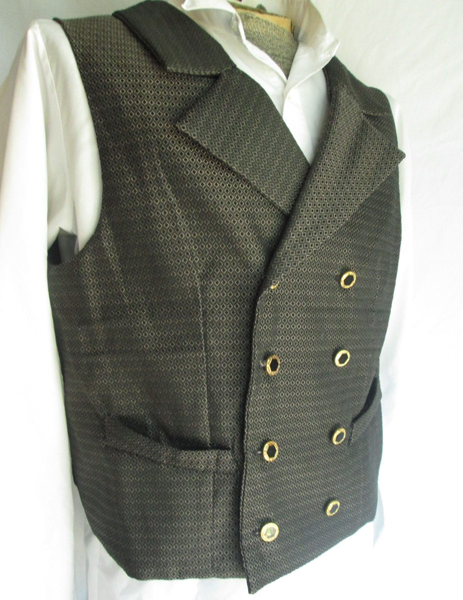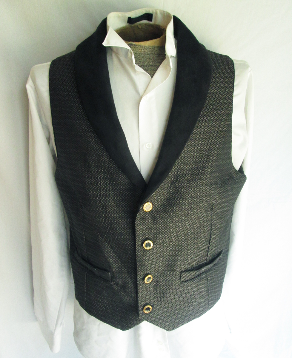 We managed to squeeze 3 vests out of this fabric, each one different in style and size. Vest A has a suede shawl collar and is in the measurement area of 45 chest/44 waist. Vest B has no collar at all and is larger, in the area of 47-49 chest/waist with adjustable back belt. Vest C has a lapel collar and is double-breasted with darts to slim down the measurements, 45 chest 42 waist. All vests have a black back and lining.