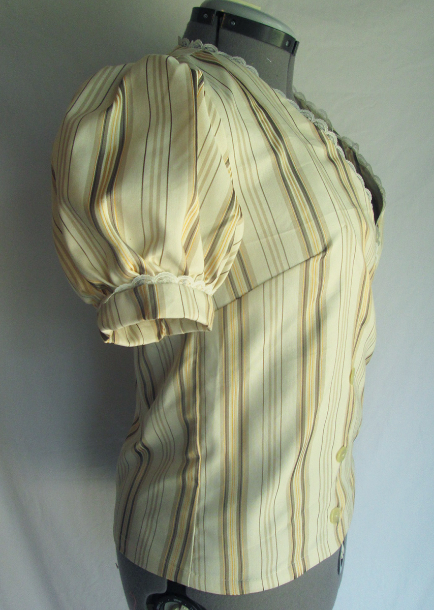 Low-cut asymmetrical collar has lace accents, which also feature on the cuffs of the gathered puff sleeves. Buttons and hidden snaps make for a secure fit that mimics a double-breasted suit or vest front. Cut with a C cup pattern, measurements approximately 40 underbust and 40 waist; additional measurements available upon request.