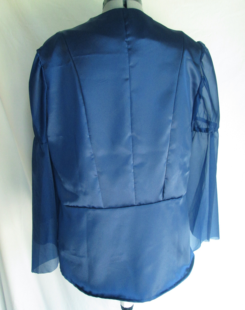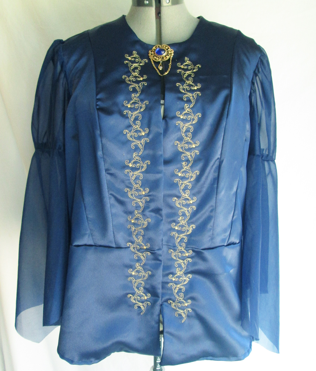 Midnight blue satin is cut with deep front and back fitting seams and a wider peplum bottom and a hidden snap closure to give it a magical smooth front. Machine embroidered with a custom pattern to match the pin, which is included. Light chiffon sleeves have a puffed upper sleeve and soft, drapey lower sleeve which is unhemmed to keep it light and floaty. Measurements approximately 48 bust and 45 waist, additional measurements available upon request.