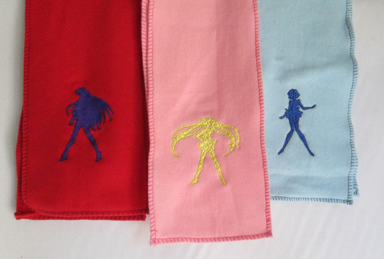 This batch rounds up all our most-favorited anime and video game franchises. Sailor Moon, One Piece, Overwatch, Kingdom Hearts - they're all here. Scarf background colors and embroideries have been carefully matched up for the best appearance. Each scarf is one-of-a-kind, so when they're sold out they're gone forever. If you don't see your favorite represented here, contact SLC directly to learn which digitized embroideries from our partner Flourish & Flair can be placed onto a custom scarf.