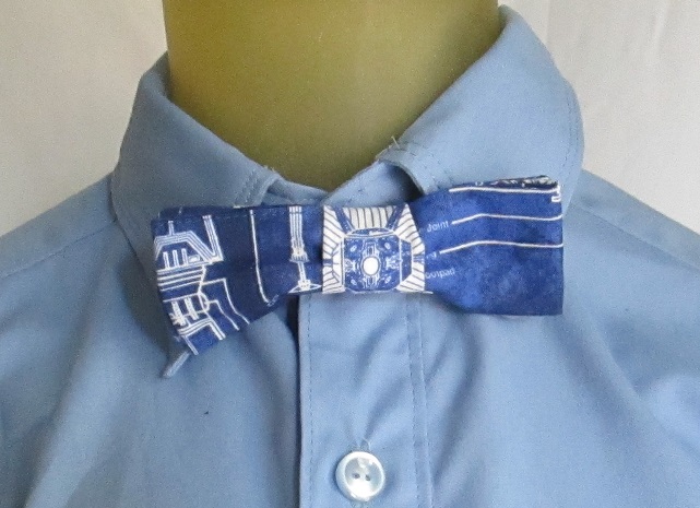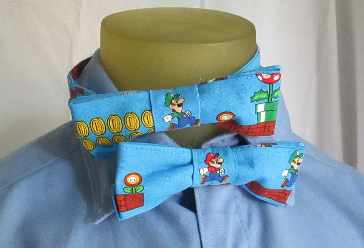 This is our last batch of bowties, once they're gone they're gone forever! Current batch of prints includes Super Mario Bros, Dr. Who, Star Wars, and novelty cow print. Custom ties crafted with the same method but different fabric prints may be possible; contact SLC directly to negotiate custom work.