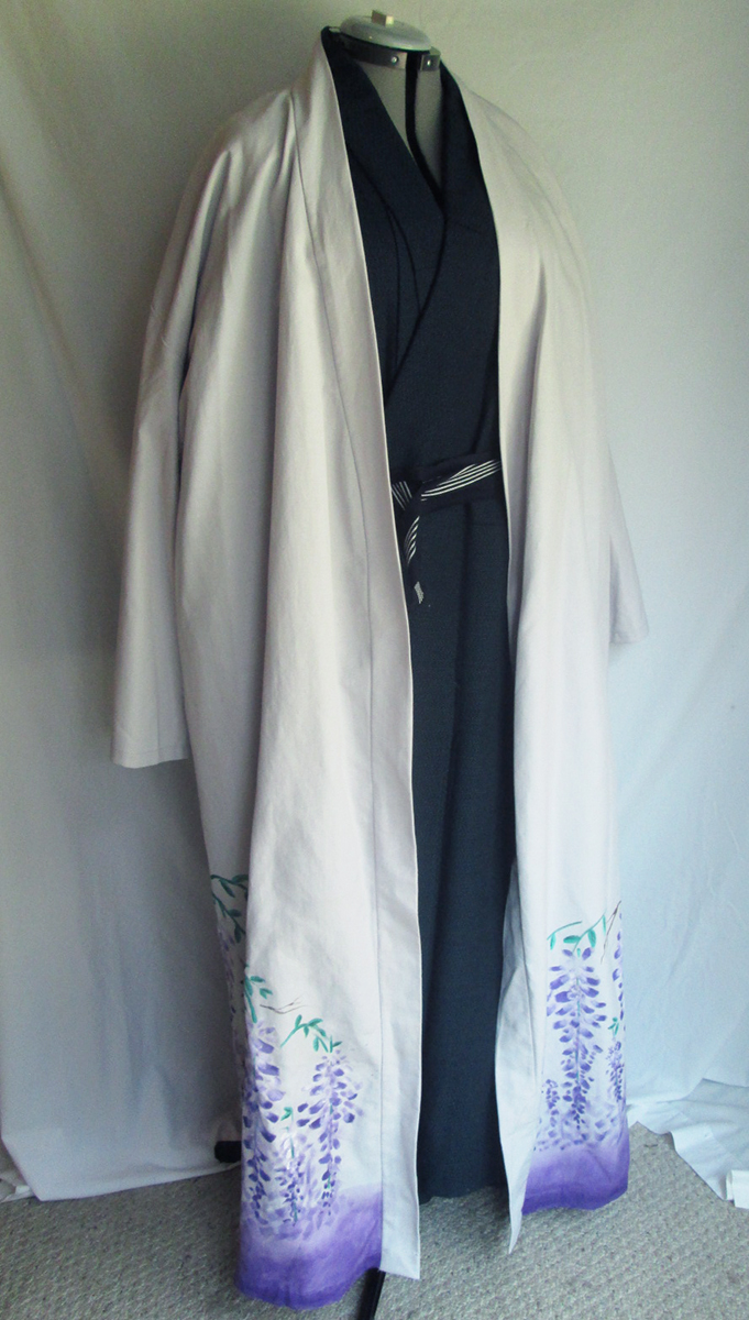 A simple Japanese haori becomes a work of art when it is hand-painted with the right motif. Shown on the model draped over a men's kimono, it is unisex and could be the perfect way to top off a historical costume or worn as Japanese-style modern garb.