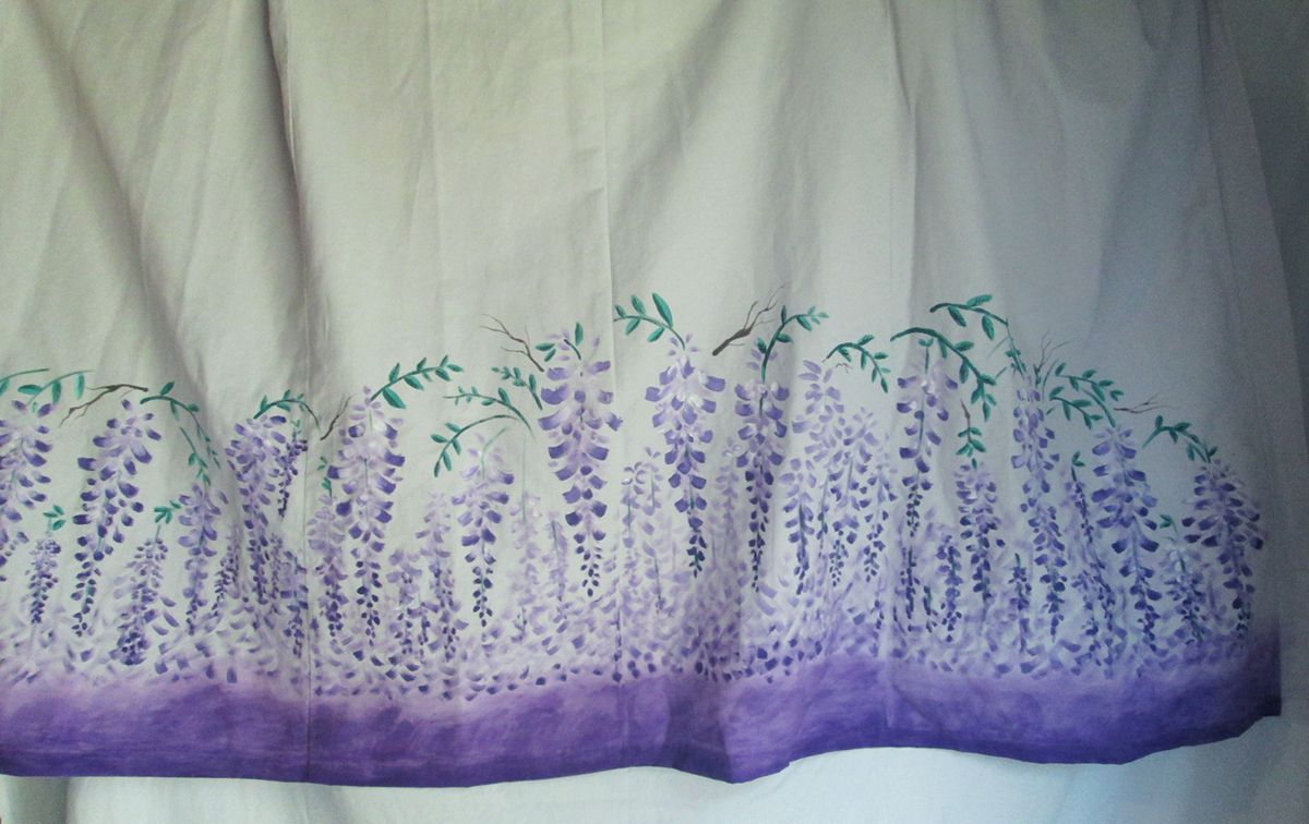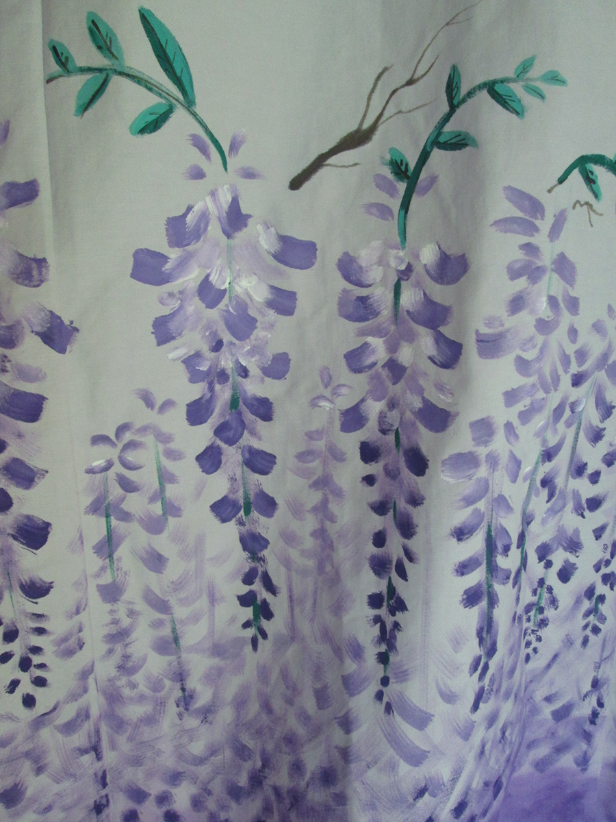 The base haori is upcycled from an unfinished cosplay, never worn, cleaned and repaired to be used as a canvas for a wisteria motif. The entire bottom hem is HAND-PAINTED, each petal is unique and can never be perfecty reproduced. The wisteria flowers fall from green vines and brown branches to a dense gradient-painted hem of deep purple. The pale lavender haori is meant to drape on the shoulders in a somewhat anime style, with no ties or closures, but can also be worn as a yukata when belted. There is no exact size; the model shown is set at around a 38-40 chest, but SLC can provide shoulder width, length, and other measurements if requested.