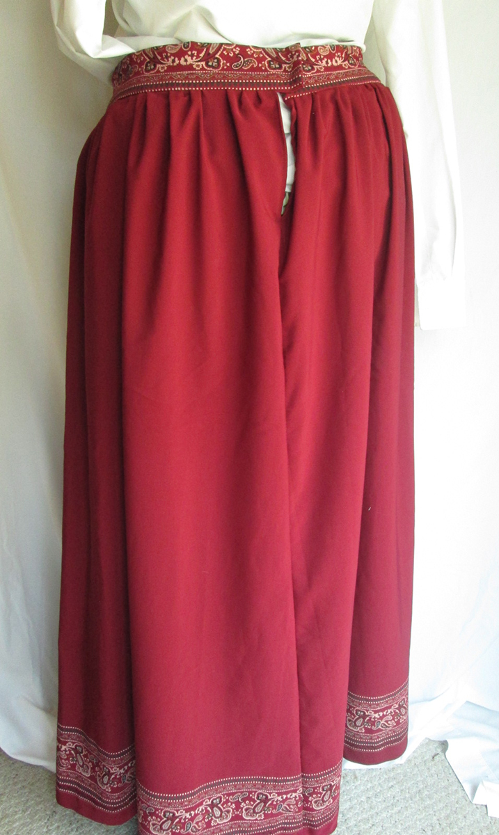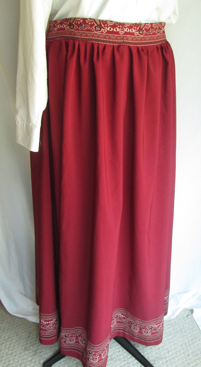 Simple fashionable skirt, floor length, with printed border detail at the bottom and also used for the waistband. Comfortable with a slight stretch along the grain.