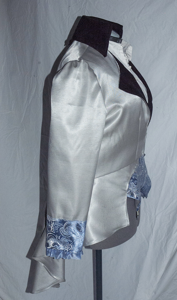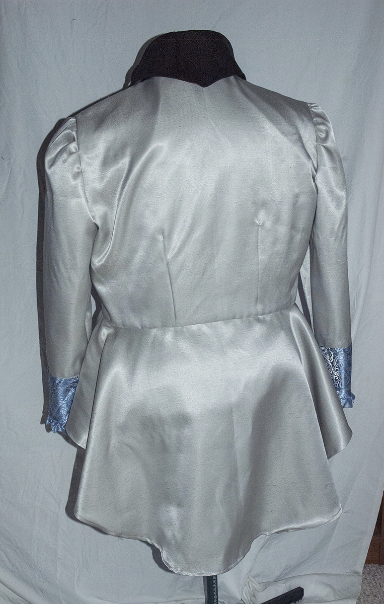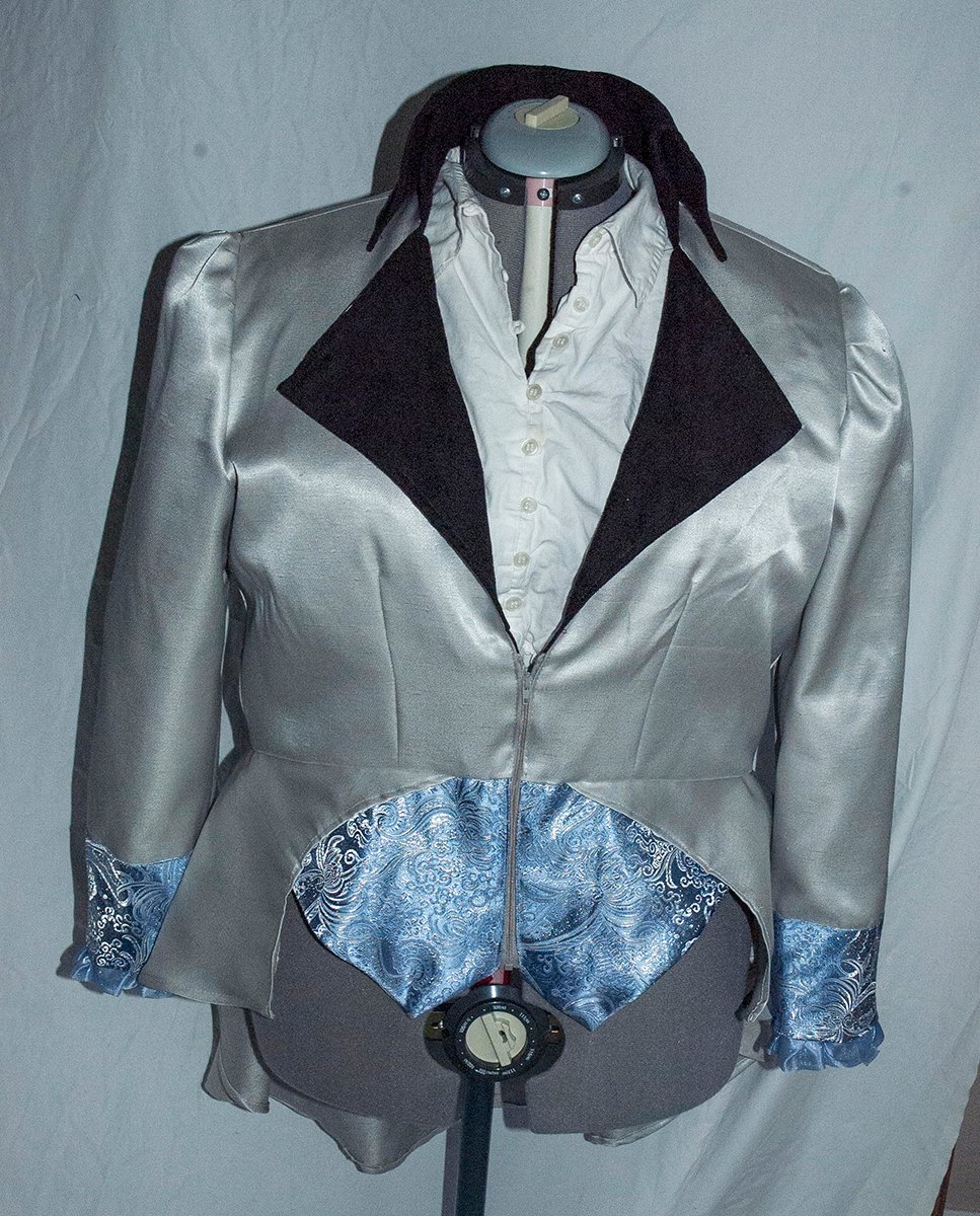 Elegant silver shantung jacket with suede collar and accents of lavender brocade, the long, fluted peplum and low cut lapel make this a fantasy outfit come to life. Can be worn as regular formal wear or paired with leggings or a skirt for a fantasy costume.